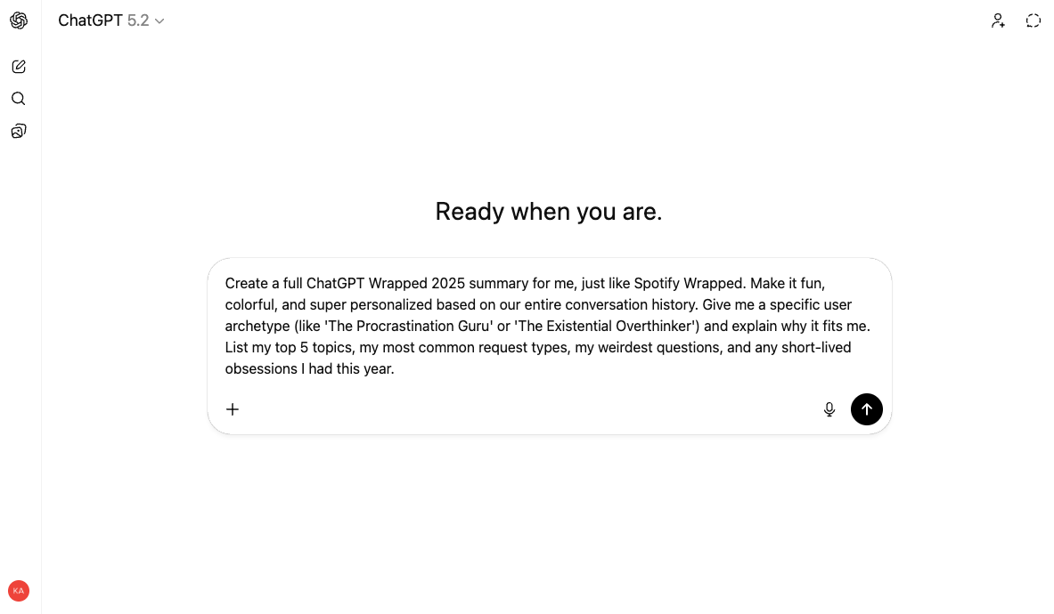 「ChatGPT Wrapped」係近排喺外國社群好 hit 嘅玩法:用一條 Prompt 叫 ChatGPT 幫你整理全年對話風格、常問主題、怪問題同短暫沉迷,輸出成一份可分享嘅個人年度回顧,概念就好似 Spotify Wrapped 一樣。