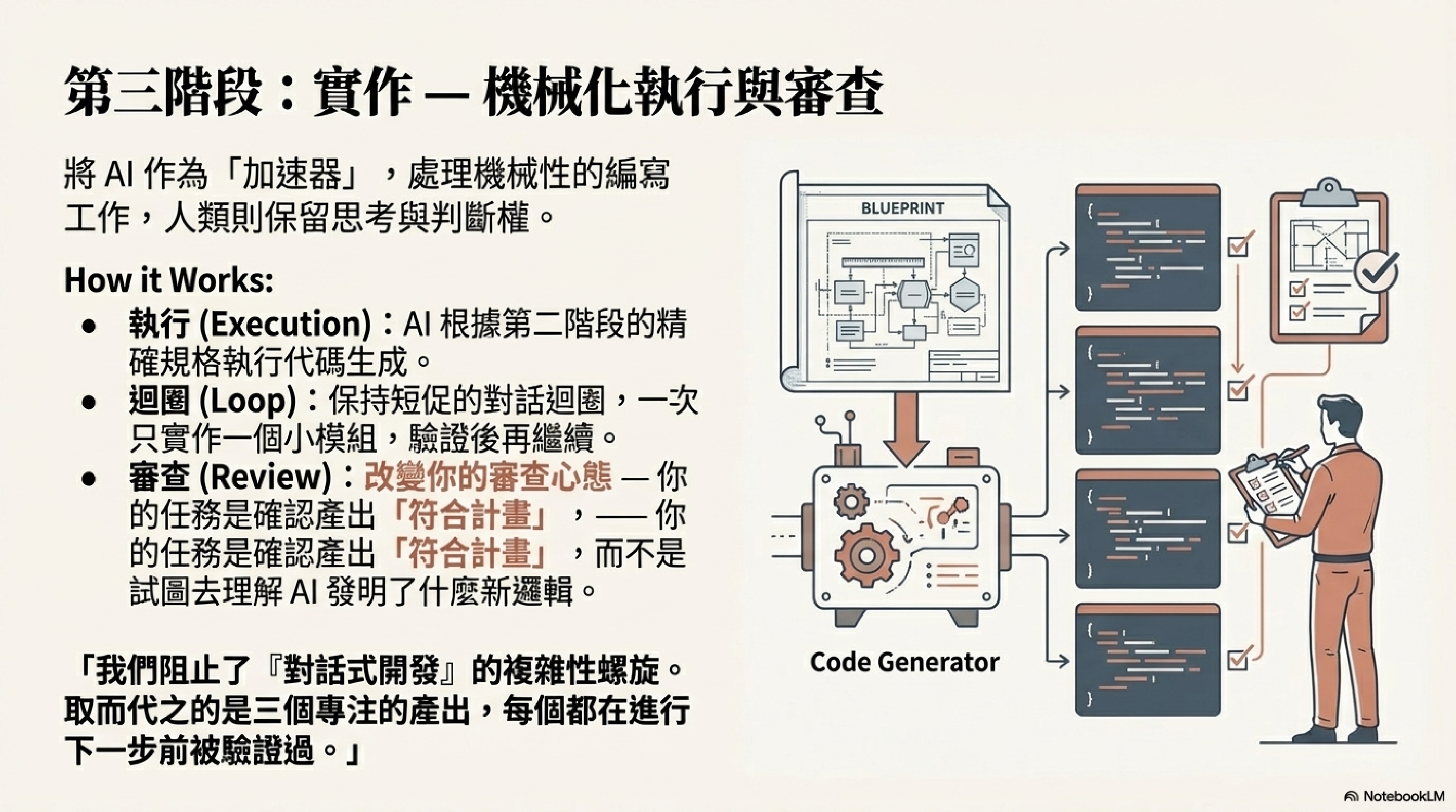 當有了清晰的規格後,實作應變得極其專注且簡單。將 AI 作為「加速器」,負責處理機械性的編寫工作,人類則保留思考與判斷權。
