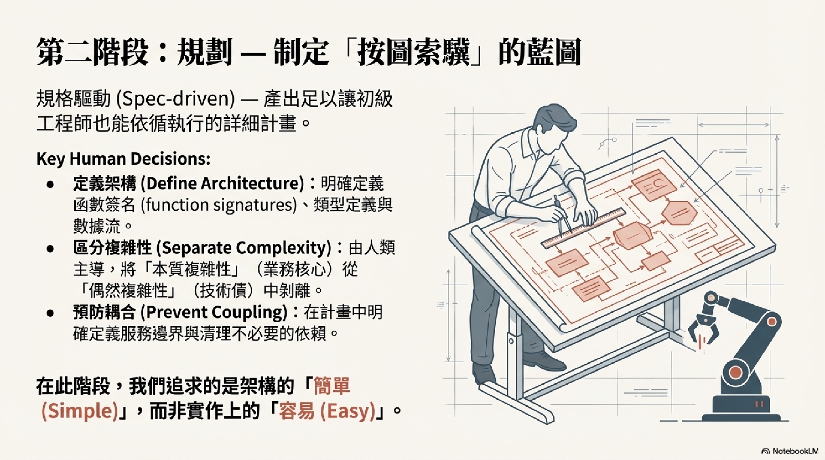 規劃的核心在於「規格驅動(Spec-driven)」,產出足以讓初級人員「按圖索驥(Paint by numbers)」的詳細計畫。