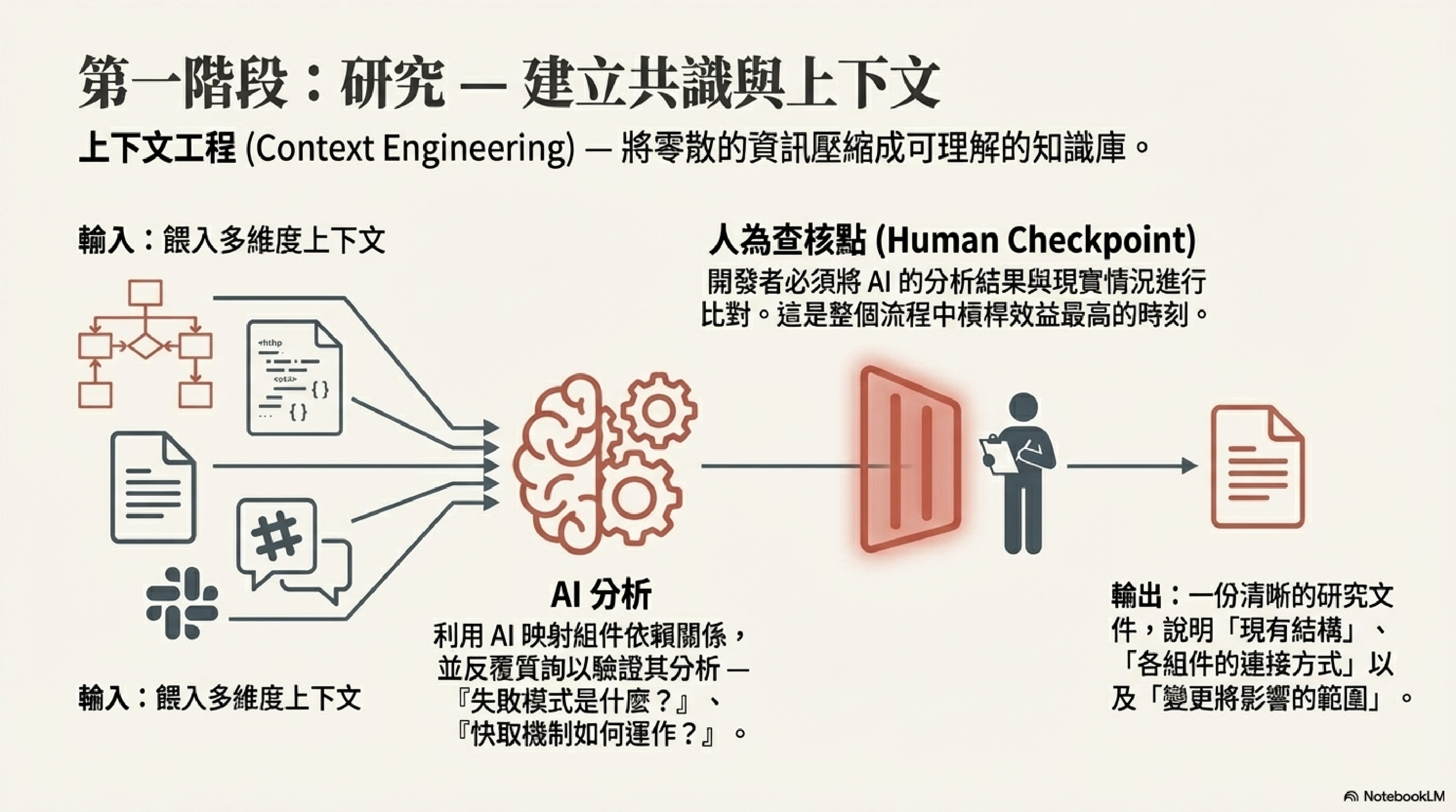 研究階段的目標在於進行「上下文工程(Context Engineering)」,將零散的資訊壓縮成可理解的知識庫。這不是要 AI 直接寫程式,而是要它幫你分析現狀。